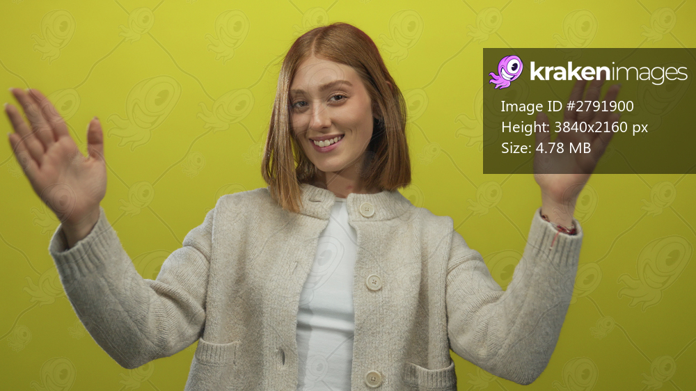 Woman smiling with hands raised wearing a cozy sweater against a vibrant yellow background conveying joy and positivity.