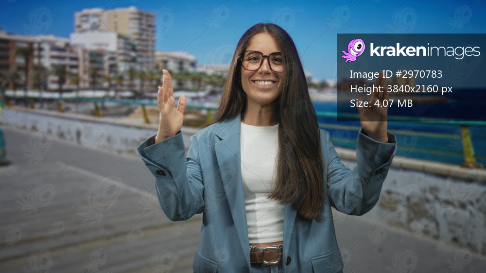 Woman smiling with hands raised wearing glasses and blue blazer on a seaside street promenade by the ocean; joy confidence.