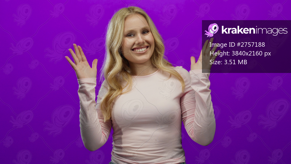 Woman smiling with hands raised wearing pink shirt against vibrant purple background showing expressive joyful gesture young blonde female portrait vibrant setting