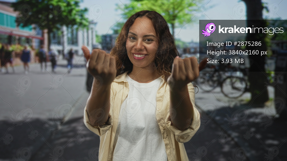 Woman smiling with hands reaching out toward camera on busy street with bicycles and pedestrians; joy welcome connection.