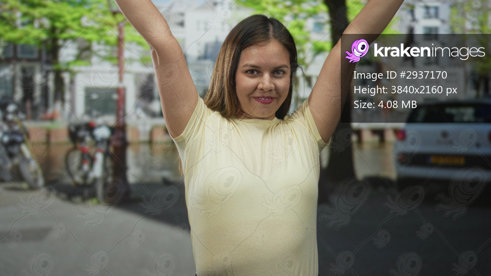 Woman smiling with hands under chin and arms raised while wearing yellow t shirt on street with bicycles and parked car; happiness confidence.