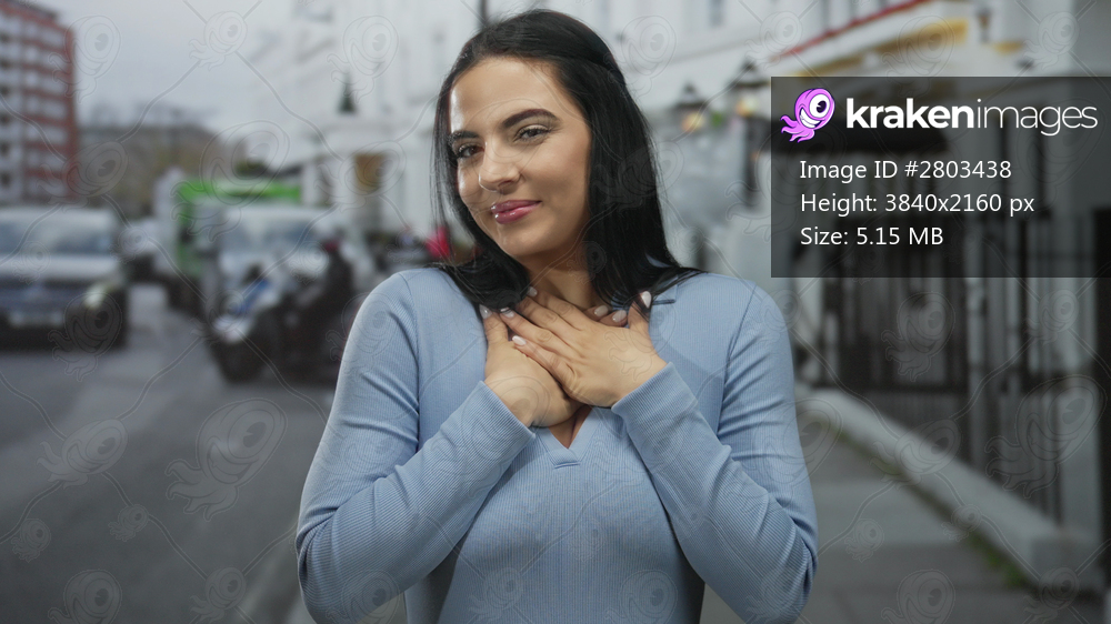 Woman smiling happily in a vibrant urban street setting with a blend of modern architecture and parked cars under a clear sky.