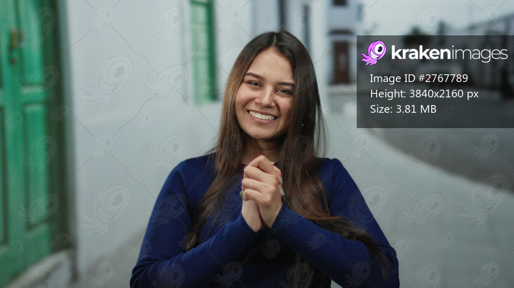 Woman smiling happily on a quiet street with a vibrant green door and white buildings in the background.