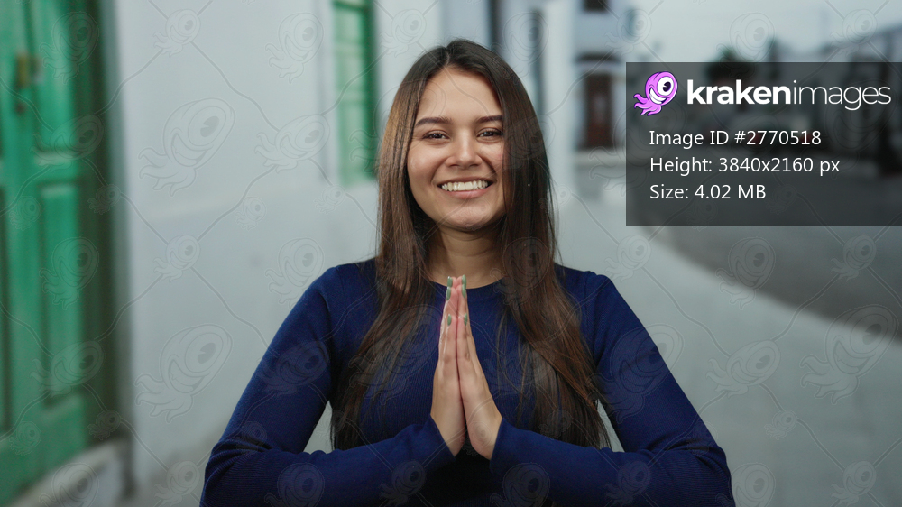Woman smiling happily on a quiet street with a vibrant green door and white buildings in the background.