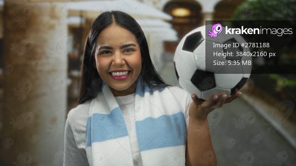 Woman smiling happily outdoors holding soccer ball in sunny courtyard wearing blue scarf enjoying sports day with greenery surrounding.