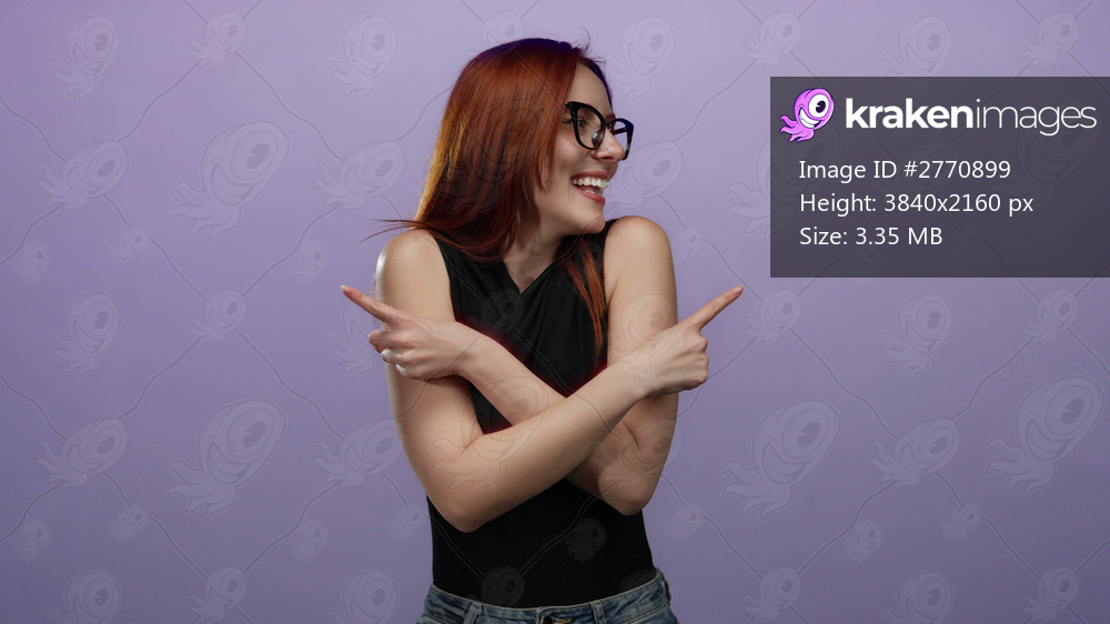 Woman smiling happily with red hair and glasses pointing on a purple background creating a playful and joyful vibe.