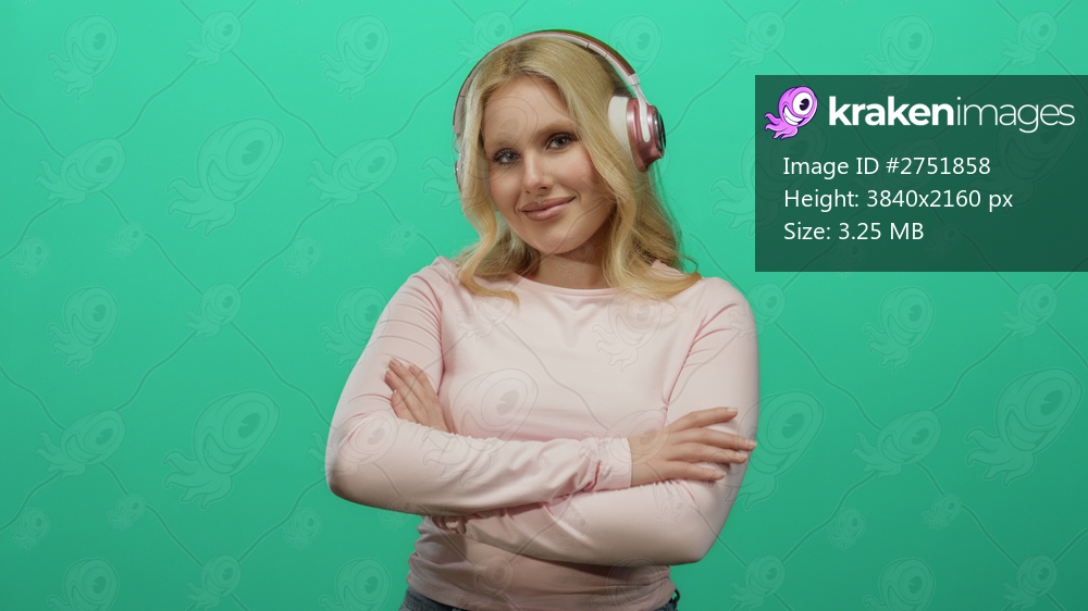 Woman smiling with headphones against a bright green background, wearing a pink top and blonde hair, exuding a cheerful demeanor in a studio setting, arms crossed confidently. - Kraken Images