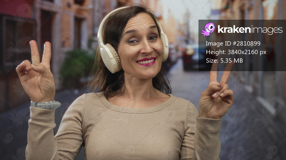 Woman smiling with headphones making peace sign on street outdoors showing happy expression while listening to music
