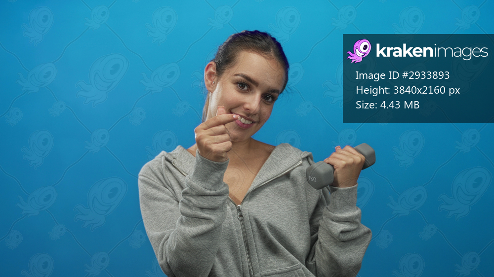 Woman smiling holding 1kg dumbbell and making finger heart with hand in blue studio; fitness motivation joy.
