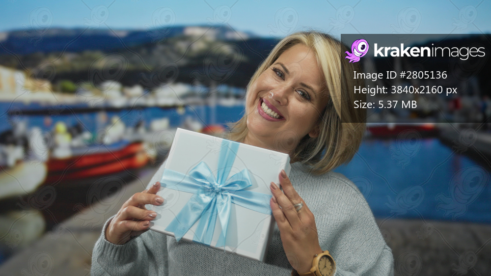 Woman smiling and holding a blue ribbon wrapped gift box at a bustling seaside port under a clear sky; happiness.