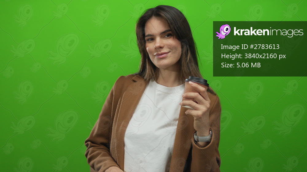 Woman smiling and holding a coffee cup against an isolated vibrant green background, embodying youthful and confident energy.