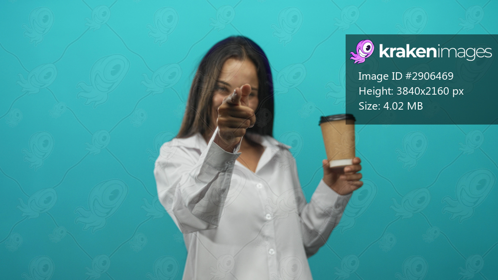 Woman smiling and holding a coffee cup while pointing finger in turquoise studio; happiness playfulness.
