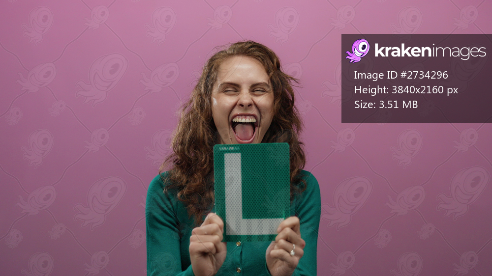 Woman smiling and holding a green learner sign against an isolated pink background wall while giving a thumbs up