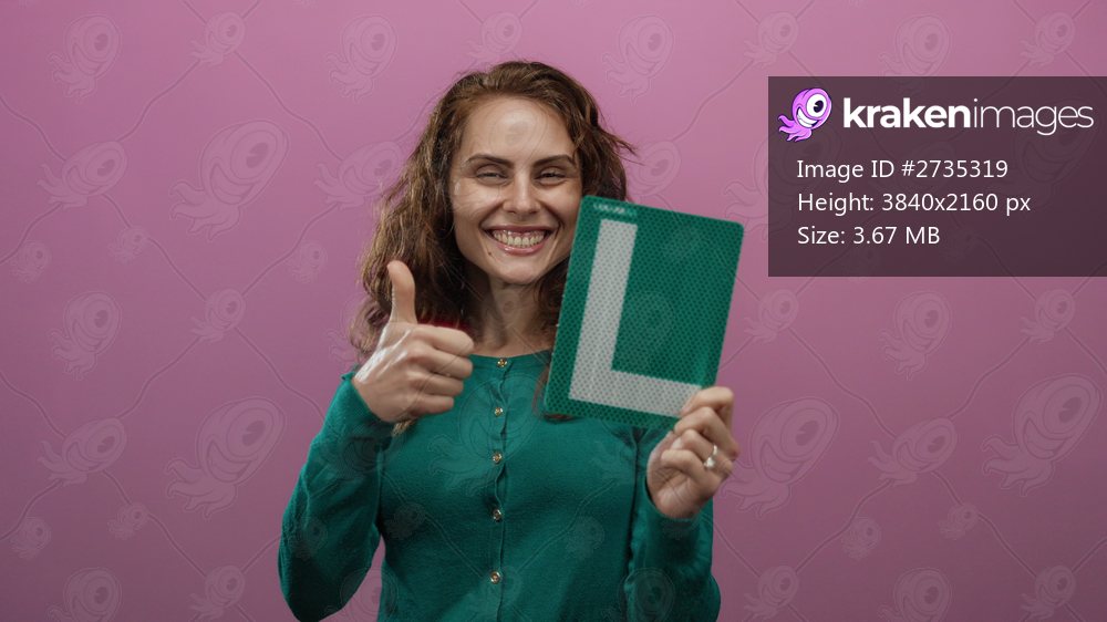 Woman smiling and holding a green learner sign against an isolated pink background wall while giving a thumbs up