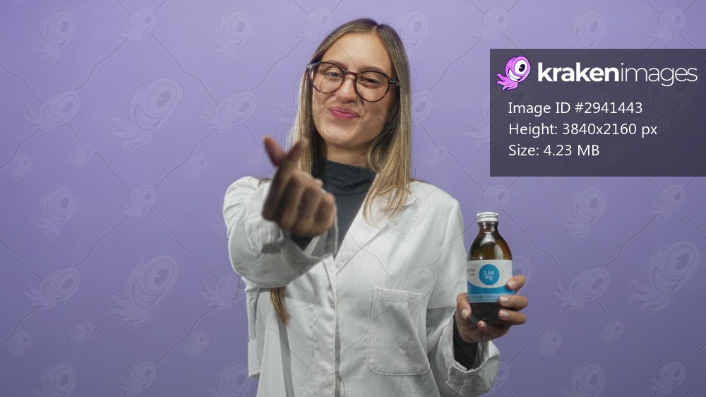 Woman smiling and holding a medicine bottle and making a finger heart gesture in a studio; friendly wellness.