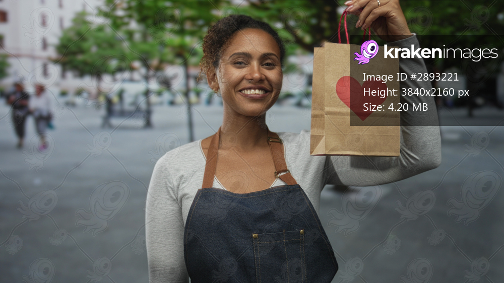 Woman smiling and holding a paper bag with a red heart while wearing denim apron on city street near trees and benches; community support joy.