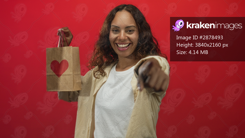 Woman smiling and holding a paper bag with red heart and pointing finger in red studio; love celebration joyful.