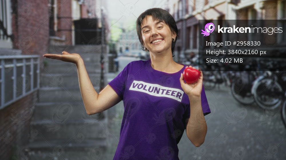 Woman smiling and holding a red heart in her right hand on a cobbled street wearing volunteer tshirt and gesturing with left palm; compassion joy.