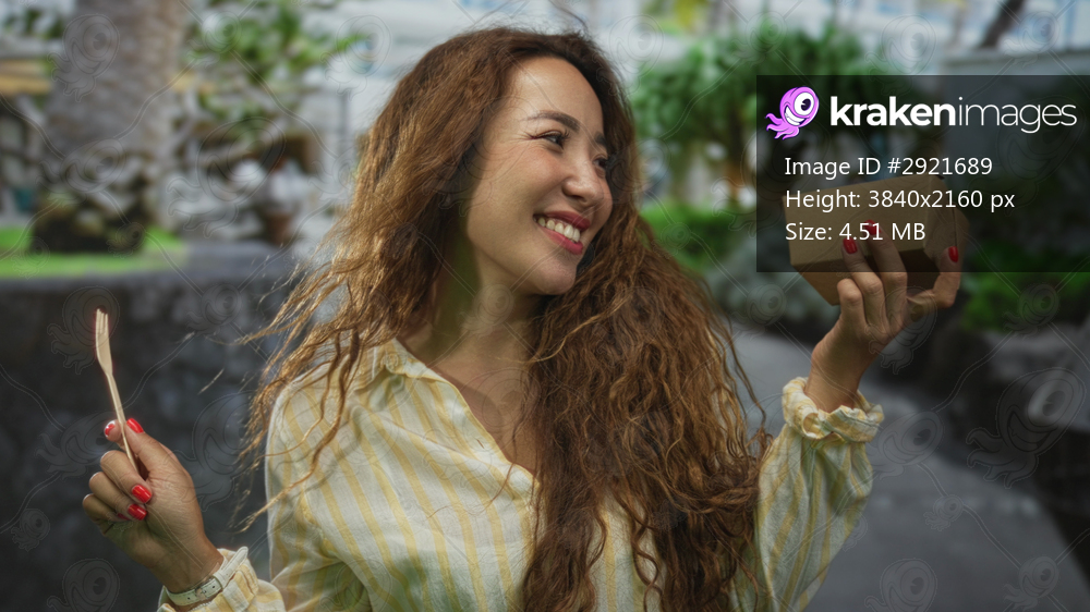 Woman smiling, holding a takeaway box in one hand and a raised hand with a fork on a street lined with trees and buildings; happiness.