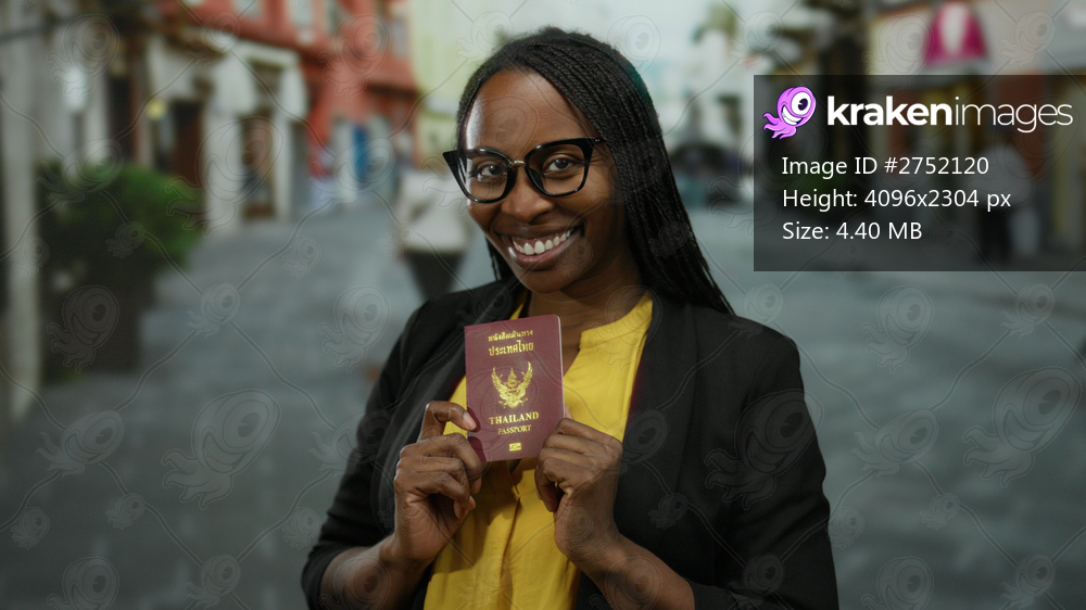 Woman smiling holding a thailand passport on an urban street with shops visible in the background.