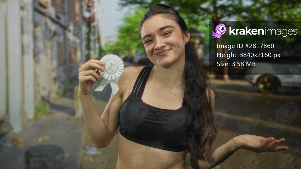 Woman smiling and holding a third place ribbon while shrugging shoulders on a busy city street; humble acceptance.