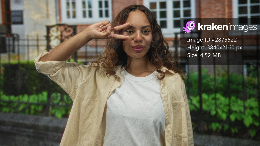 Woman smiling and holding a v sign with two fingers to her eye in front of building entrance outdoors, wearing white t shirt and beige overshirt; joy.
