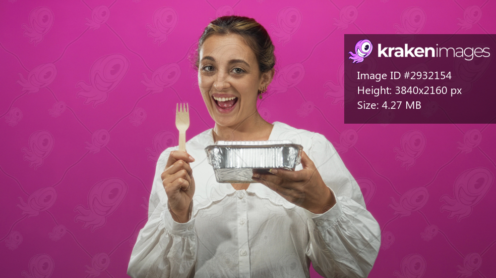 Woman smiling and holding a wooden fork and aluminum takeaway tray while wearing white blouse in pink studio; happy appetite.