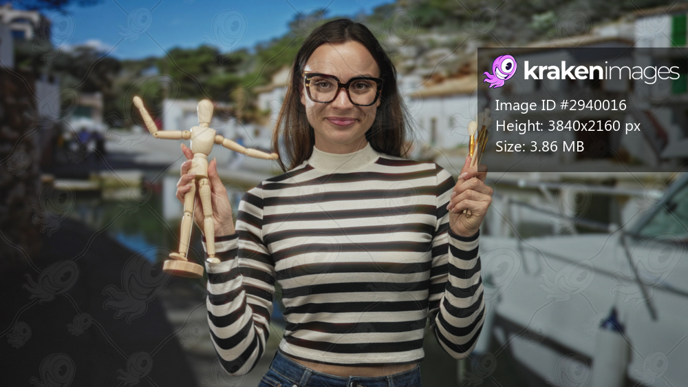 Woman smiling and holding a wooden mannequin and paintbrushes with hands raised on a street by boats and marina buildings; playful creativity.