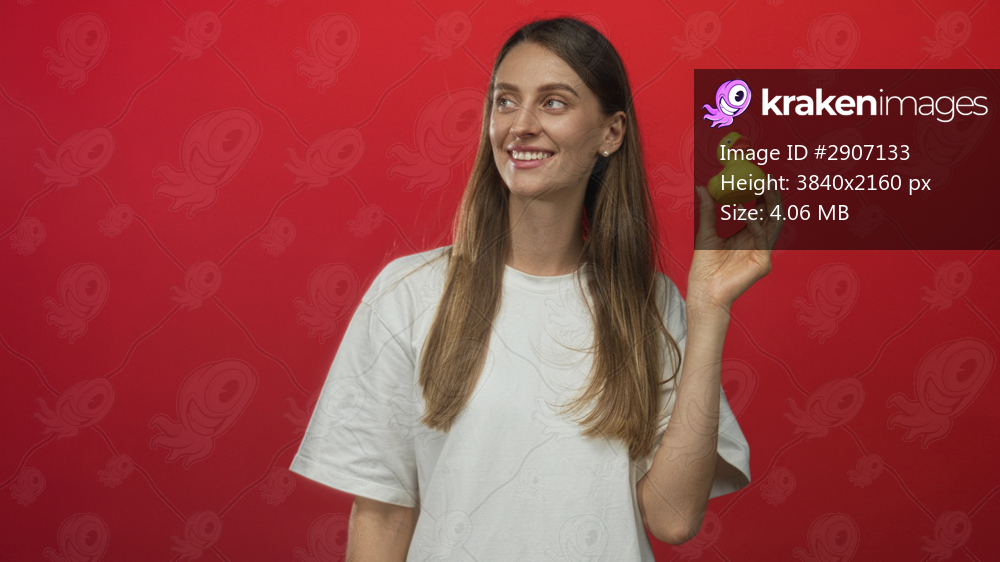 Woman smiling holding a yellow rubber duck up by hand while wearing white t shirt in red studio; playful play.