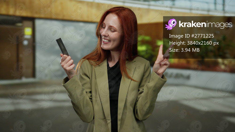 Woman smiling and holding an australian passport outdoors in a city street environment, showcasing travel enthusiasm and identification readiness.