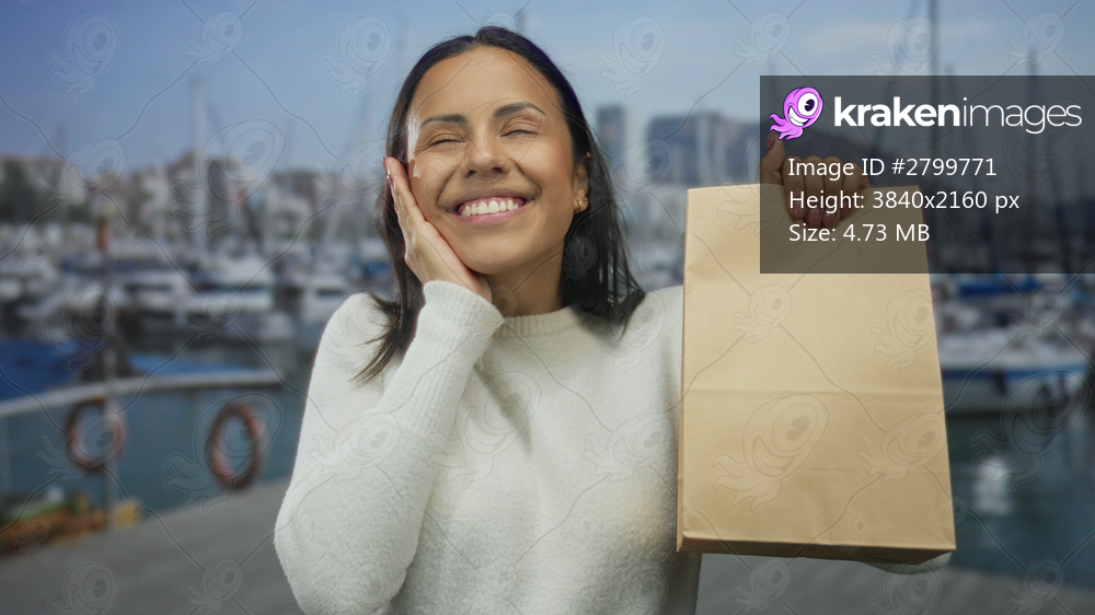 Woman smiling holding bag at vibrant seaside port with boats and blue sky, showcasing a joyful moment outdoors in a picturesque harbor backdrop.