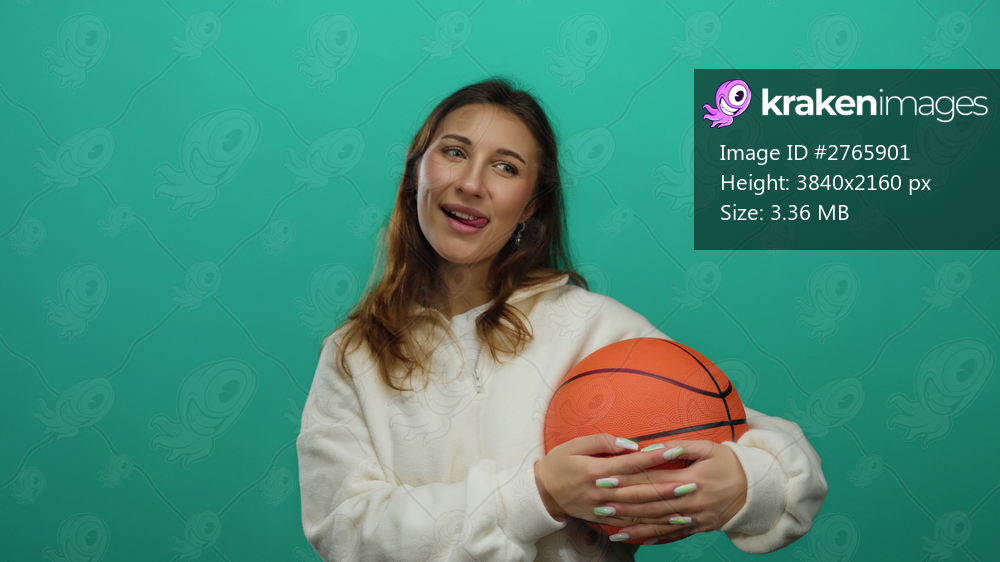 Woman smiling and holding basketball against vibrant green background, youthful energy highlighting casual style and playful nature in a simple isolated setting. - Kraken Images