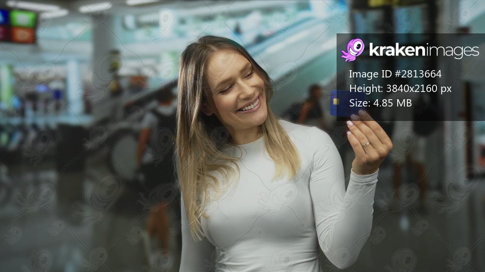 Woman smiling holding blue credit card at airport indoor location with blonde hair surrounded by bright lights and blurred travelers in background.