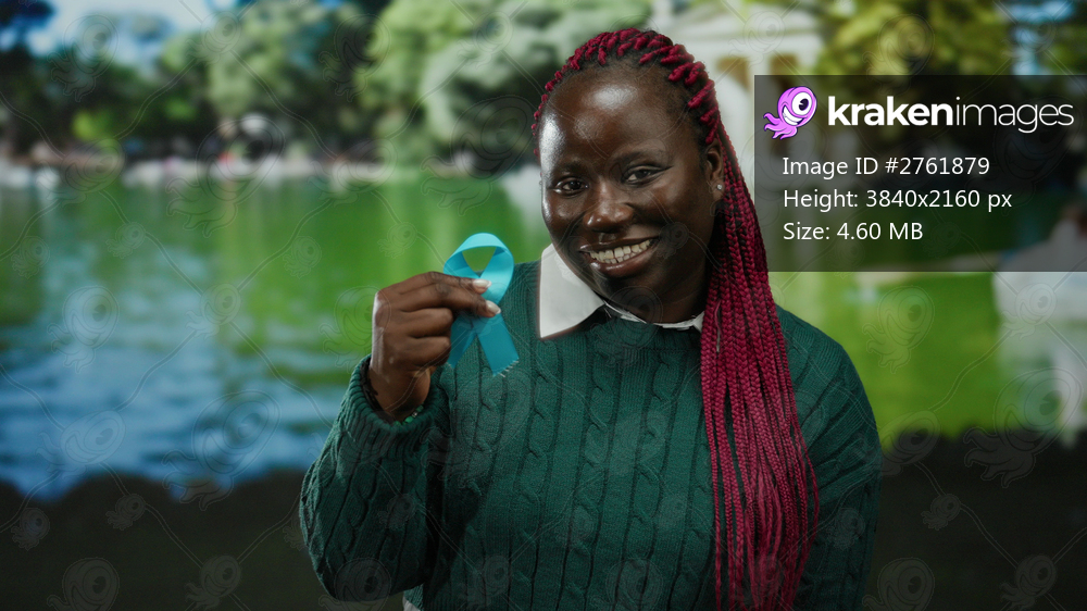 Woman smiling holding blue ribbon in park with vibrant greenery reflecting on water, symbolizing peaceful outdoor awareness.