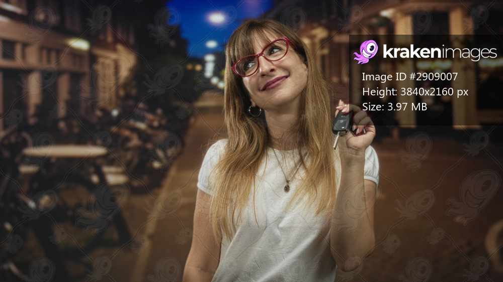 Woman smiling holding car key in hand on city street at night near bicycle racks; playful independence freedom.