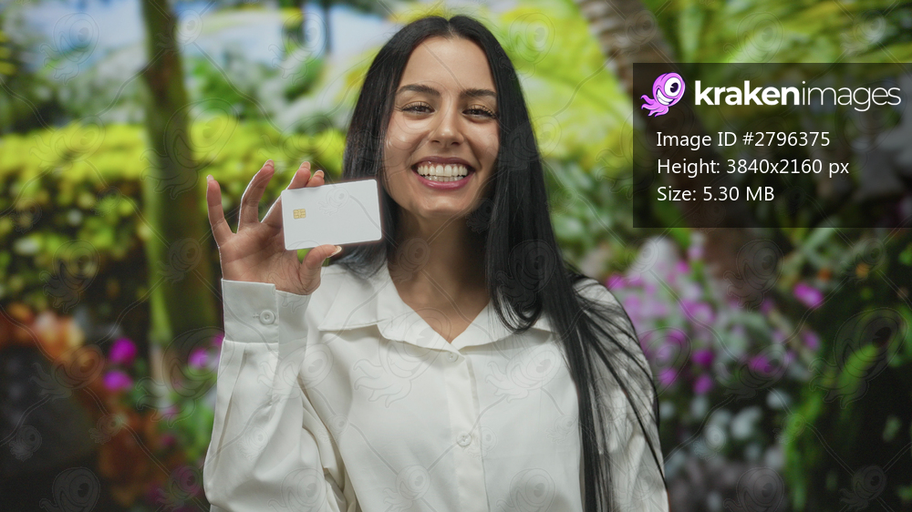 Woman smiling holding card in outdoor park setting with tropical plants and flowers, showcasing a cheerful and relaxed atmosphere.