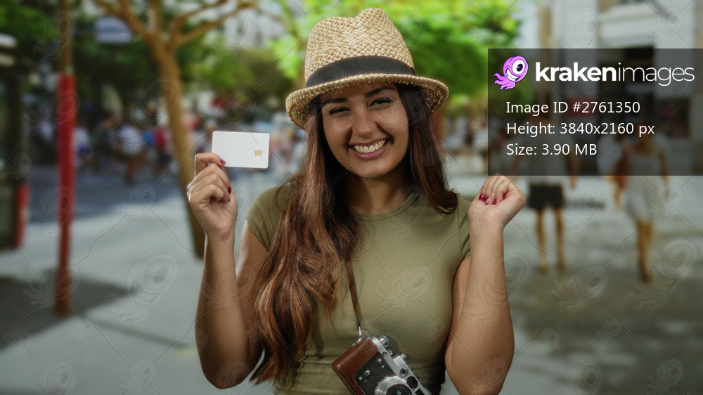 Woman smiling holding card outdoor wearing hat and camera surrounded by street setting with blurred people suggesting cheerful tourist atmosphere