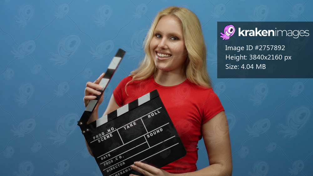 Woman smiling holding clapperboard against blue background in vibrant studio setting showcasing filmmaking tools