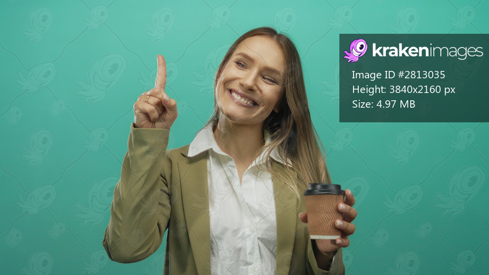 Woman smiling holding coffee against green background in casual office attire with blonde hair pointing upward
