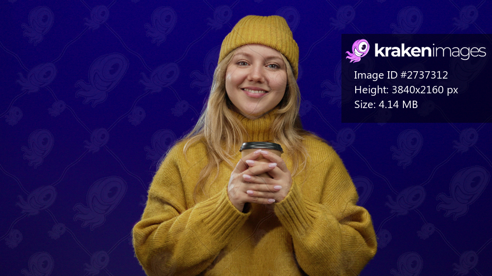 Woman smiling holding coffee cup wearing yellow sweater and hat against isolated blue background.