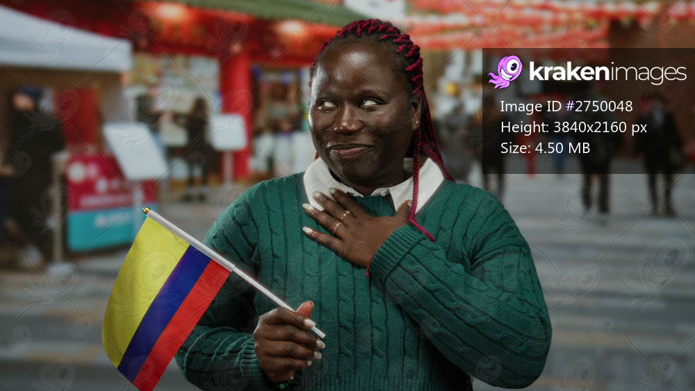 Woman smiling holding colombia flag on busy city street with vibrant colors and diverse crowd showcasing urban life and cultural pride.