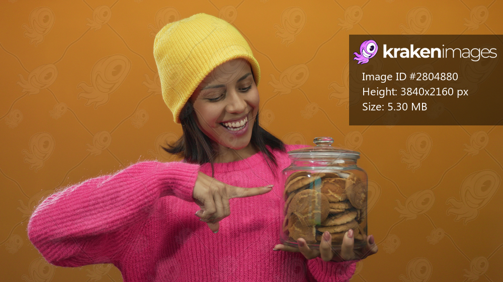Woman smiling holding cookies jar wearing yellow hat pink sweater against orange background