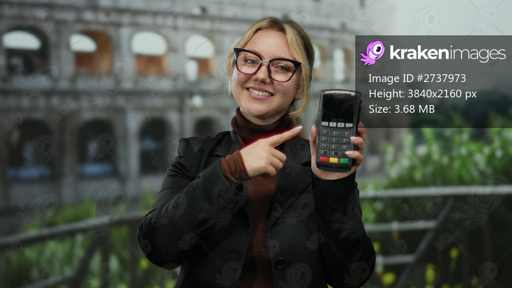 Woman smiling holding credit card machine in front of roman coliseum in italy outdoor setting suggesting travel technology international payment.
