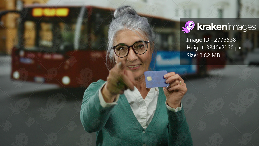 Woman smiling holding credit card on busy street with bus in background, highlighting urban lifestyle and financial independence in city setting.