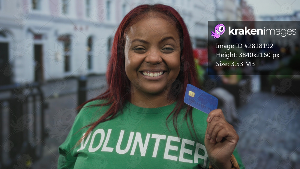 Woman smiling and holding creditcard while wearing volunteer tee on street in city outdoors; charity donation joy.