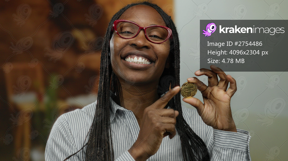 Woman smiling holding crypto coin in indoor room setting showing positive gesture with red glasses and striped shirt conveying success in digital currency. - Kraken Images