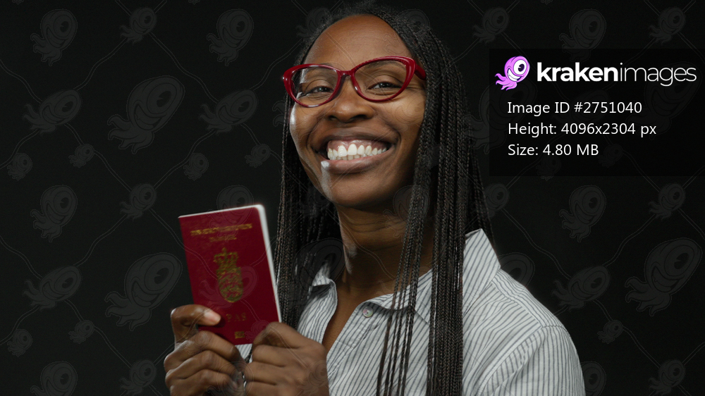 Woman smiling holding danish passport against black background wearing red glasses and striped shirt showcasing joyful expression.