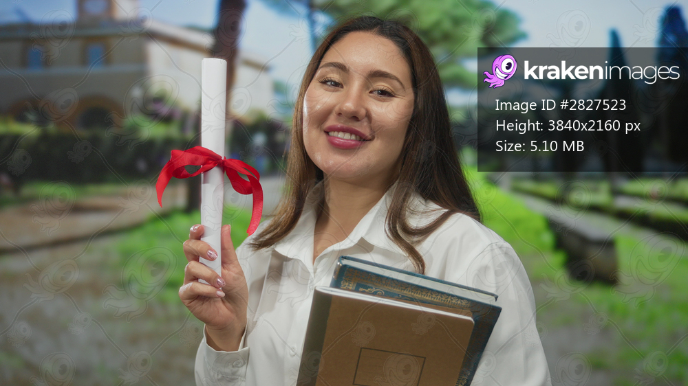 Woman smiling and holding diploma scroll and books in front of green building entrance with paved courtyard; achievement pride.