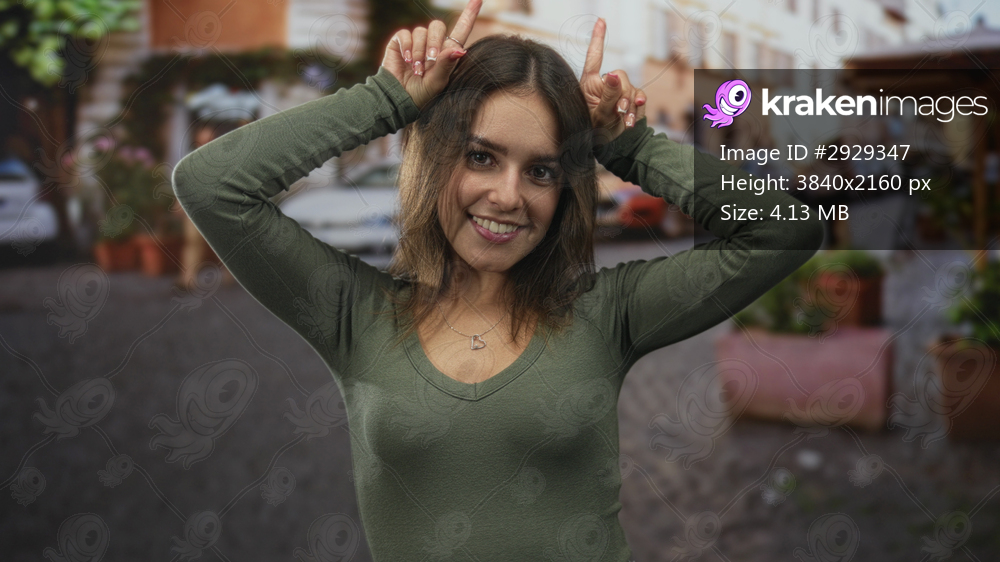 Woman smiling and holding fingers as horns to her head on a cobblestone street in the city; playful joy.