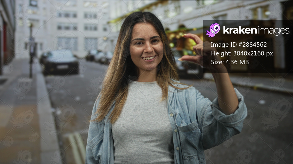 Woman smiling and holding fingers close on street with parked cars and lights, denim shirt and ring visible; playful confidence.